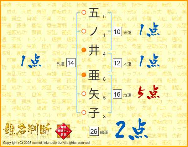 生活面を象徴する運勢です。外部から受ける影響力を表し、結婚運、家庭運や職場、環境への順応性を表します。総運から人運を引いた画数。姓や名が1文字の場合を除く。