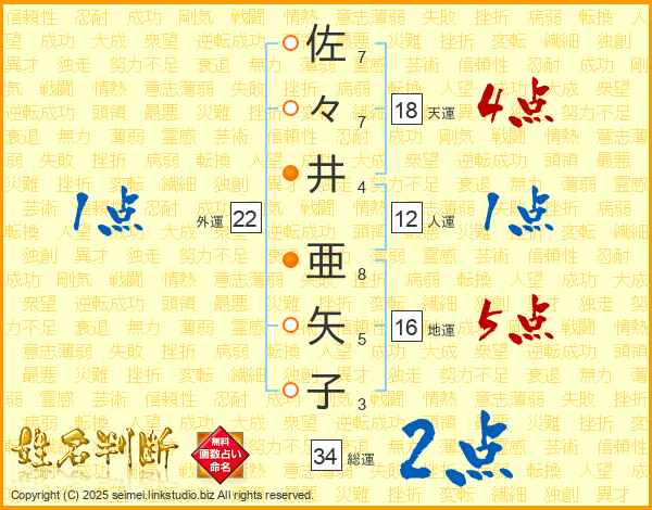 佐(7画)々(7画)井(4画) 亜(8画)矢(5画)子(3画)