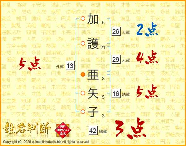 加(5画)護(21画) 亜(8画)矢(5画)子(3画)