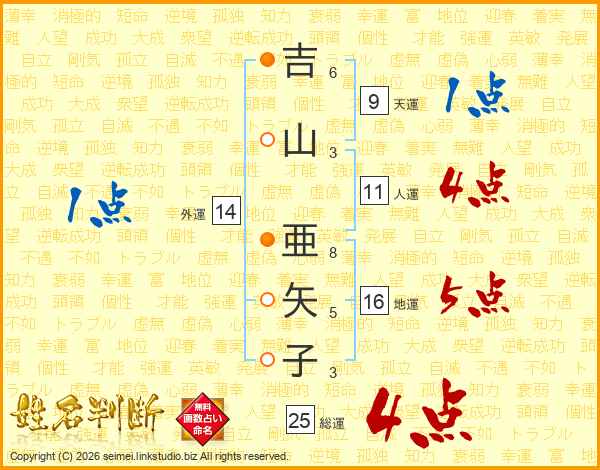 吉(6画)山(3画) 亜(8画)矢(5画)子(3画)