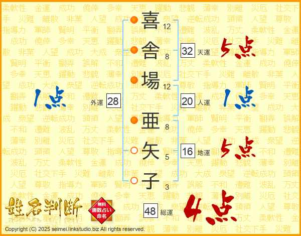喜(12画)舎(8画)場(12画) 亜(8画)矢(5画)子(3画)