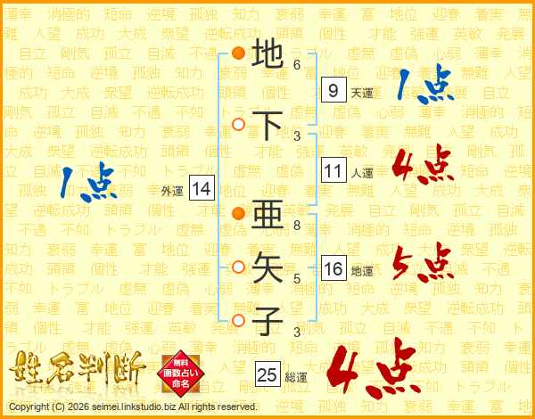 地(6画)下(3画) 亜(8画)矢(5画)子(3画)