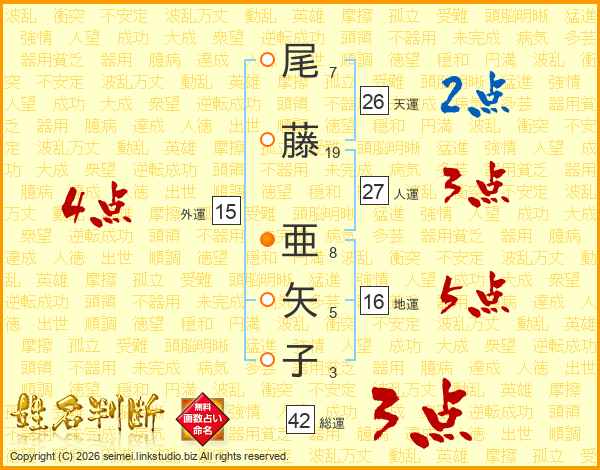 尾(7画)藤(19画) 亜(8画)矢(5画)子(3画)
