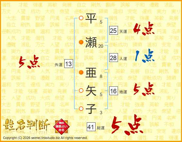 平(5画)瀬(20画) 亜(8画)矢(5画)子(3画)
