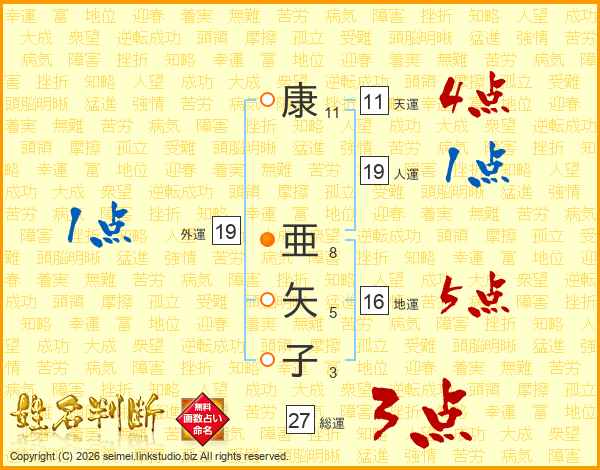 生活面を象徴する運勢です。外部から受ける影響力を表し、結婚運、家庭運や職場、環境への順応性を表します。総運から人運を引いた画数。姓や名が1文字の場合を除く。