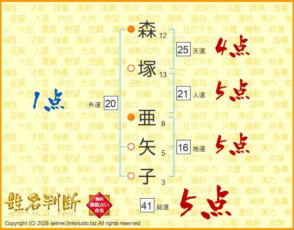 森(12画)塚(13画) 亜(8画)矢(5画)子(3画)