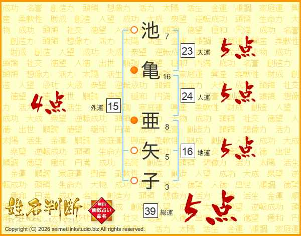 池亀亜矢子さんの総運は39画の5点!