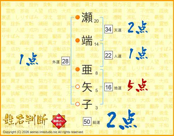 瀬端亜矢子さんの総運は50画の2点!