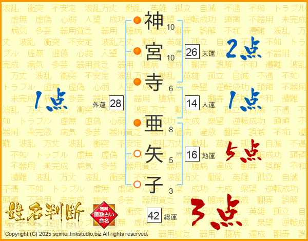 神(10画)宮(10画)寺(6画) 亜(8画)矢(5画)子(3画)
