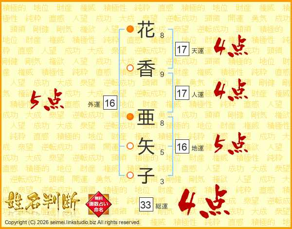 花香亜矢子さんの総運は33画の4点!