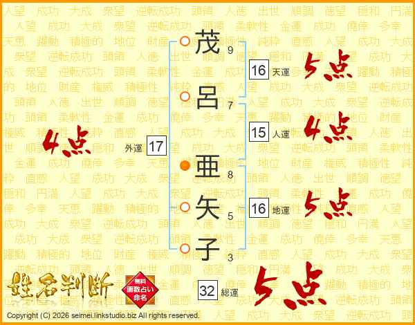 茂(9画)呂(7画) 亜(8画)矢(5画)子(3画)