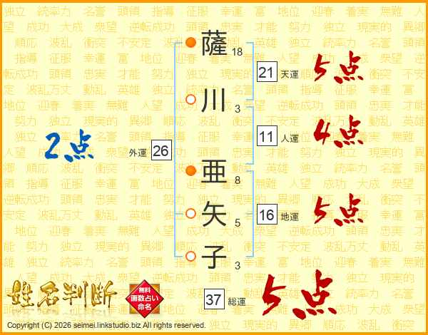 薩川亜矢子さんの総運は37画の5点!