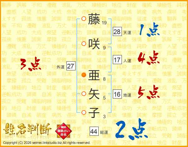 藤(19画)咲(9画) 亜(8画)矢(5画)子(3画)