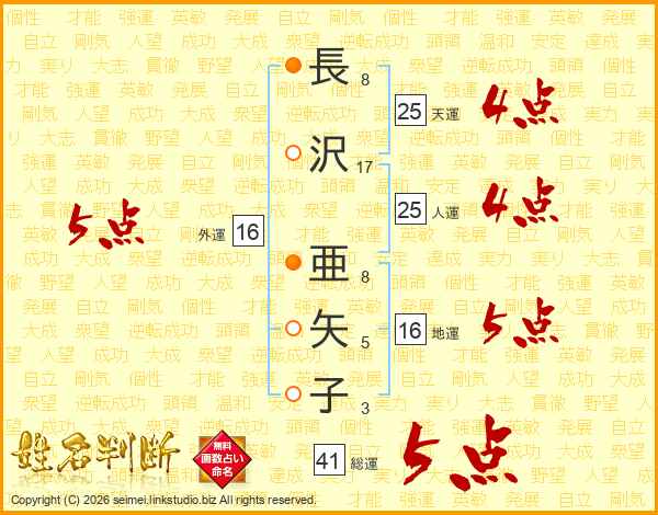 長(8画)沢(17画) 亜(8画)矢(5画)子(3画)
