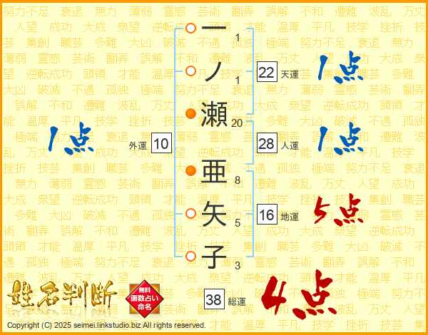 一ノ瀬亜矢子さんの総運は38画の4点!