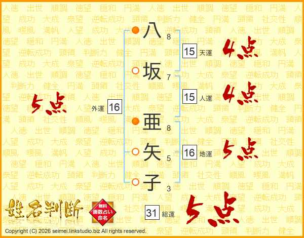 八(8画)坂(7画) 亜(8画)矢(5画)子(3画)