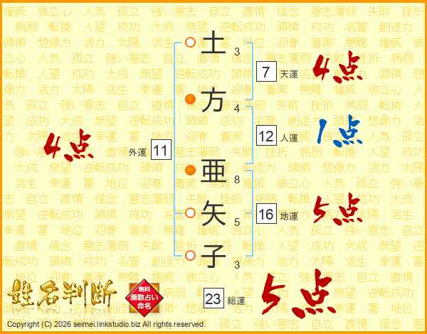 土(3画)方(4画) 亜(8画)矢(5画)子(3画)