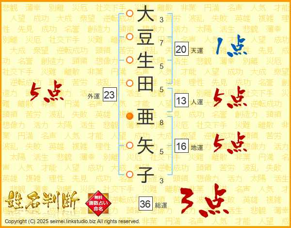 大(3画)豆(7画)生(5画)田(5画) 亜(8画)矢(5画)子(3画)