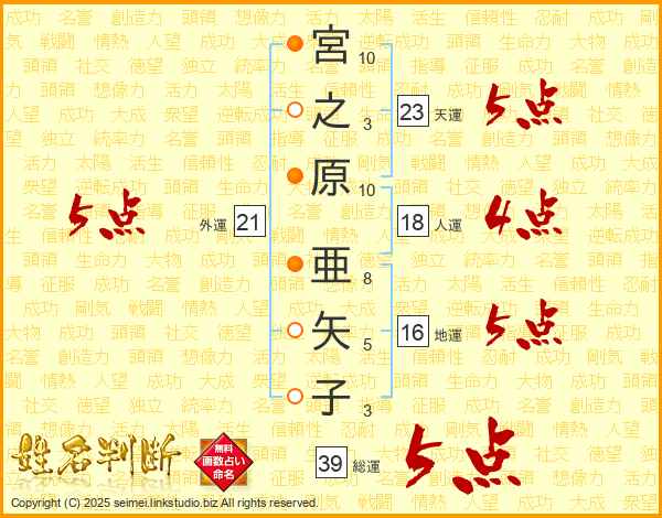 宮(10画)之(3画)原(10画) 亜(8画)矢(5画)子(3画)