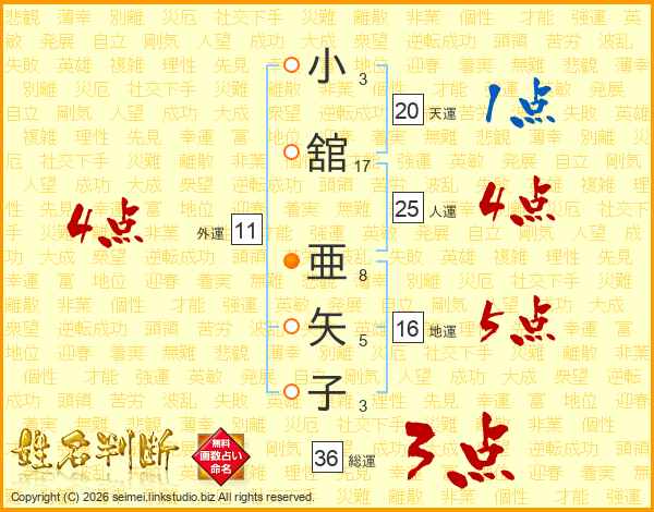 小(3画)舘(17画) 亜(8画)矢(5画)子(3画)