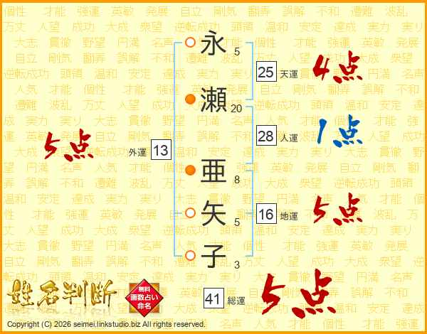 永(5画)瀬(20画) 亜(8画)矢(5画)子(3画)