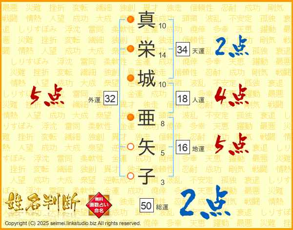 真(10画)栄(14画)城(10画) 亜(8画)矢(5画)子(3画)