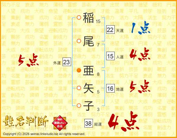 稲(15画)尾(7画) 亜(8画)矢(5画)子(3画)