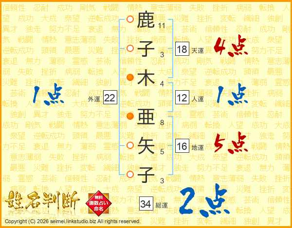 鹿(11画)子(3画)木(4画) 亜(8画)矢(5画)子(3画)