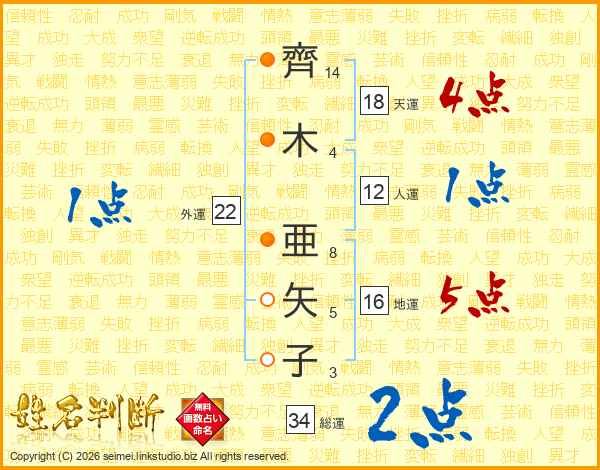 齊木亜矢子さんの総運は34画の2点!