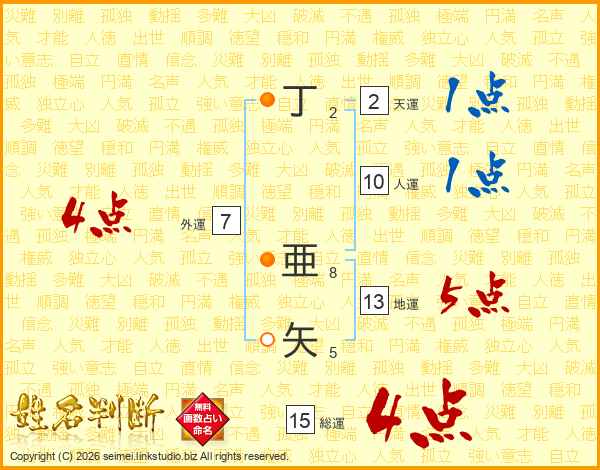 生活面を象徴する運勢です。外部から受ける影響力を表し、結婚運、家庭運や職場、環境への順応性を表します。総運から人運を引いた画数。姓や名が1文字の場合を除く。