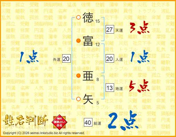 徳(15画)富(12画) 亜(8画)矢(5画)