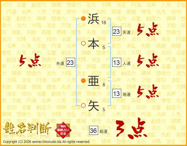 浜(18画)本(5画) 亜(8画)矢(5画)