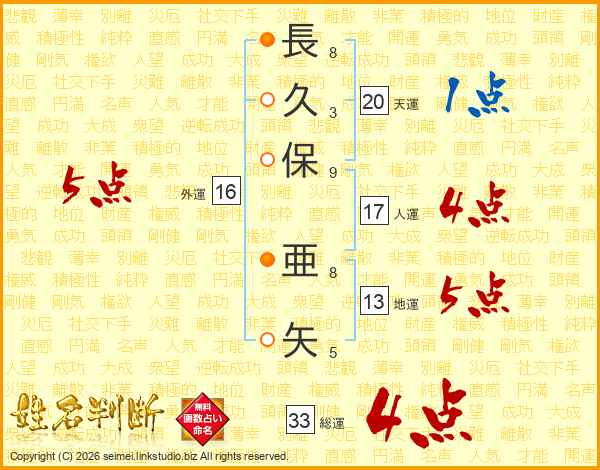 長(8画)久(3画)保(9画) 亜(8画)矢(5画)