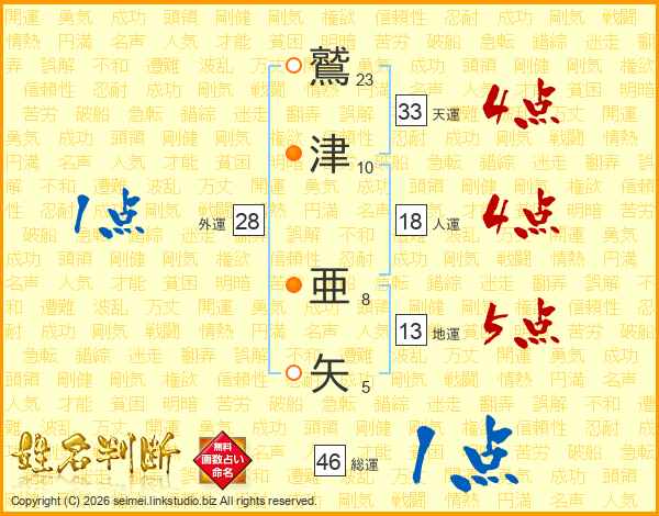 鷲(23画)津(10画) 亜(8画)矢(5画)