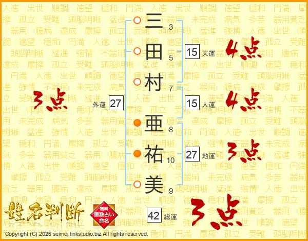 三(3画)田(5画)村(7画) 亜(8画)祐(10画)美(9画)