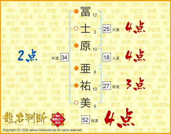 冨(12画)士(3画)原(10画) 亜(8画)祐(10画)美(9画)