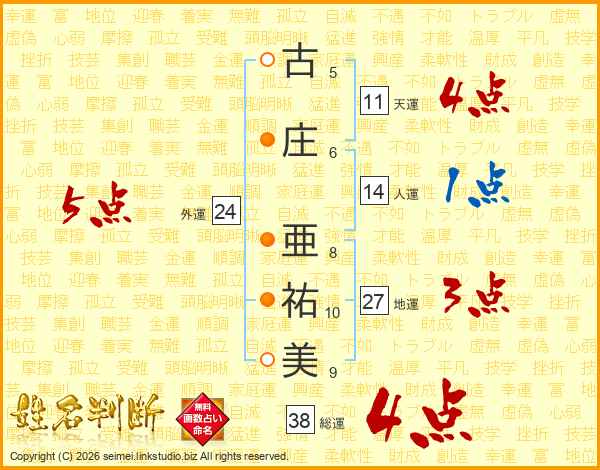古庄亜祐美さんの総運は38画の4点!