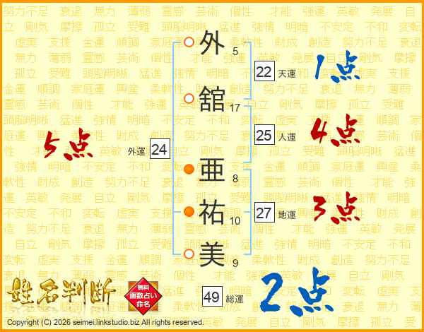 外(5画)舘(17画) 亜(8画)祐(10画)美(9画)