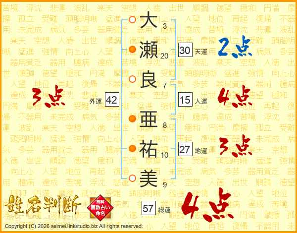 大(3画)瀬(20画)良(7画) 亜(8画)祐(10画)美(9画)