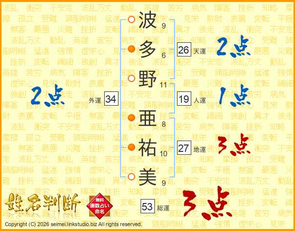 波(9画)多(6画)野(11画) 亜(8画)祐(10画)美(9画)