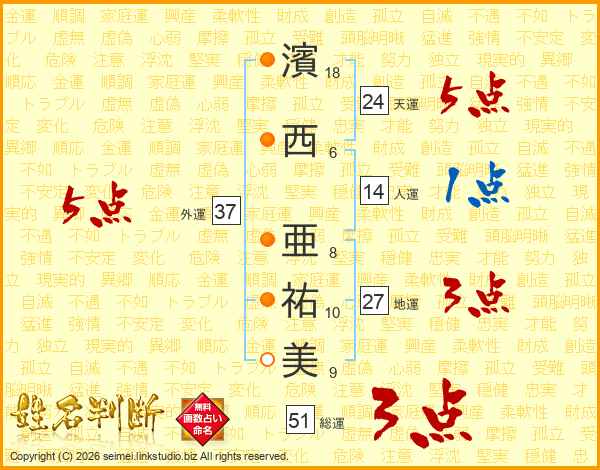 濱(18画)西(6画) 亜(8画)祐(10画)美(9画)