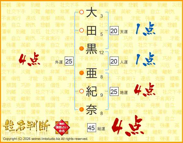 大(3画)田(5画)黒(12画) 亜(8画)紀(9画)奈(8画)