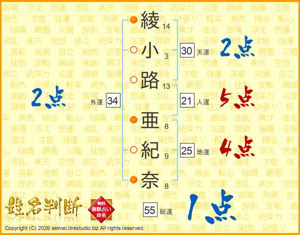 綾(14画)小(3画)路(13画) 亜(8画)紀(9画)奈(8画)