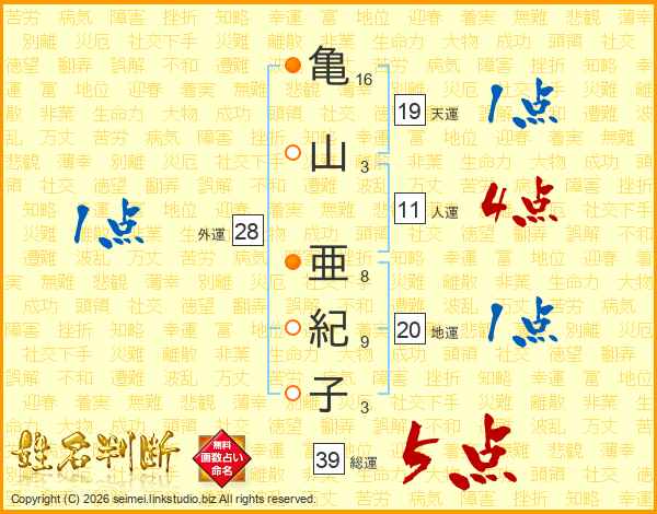 亀山亜紀子さんの総運は39画の5点!