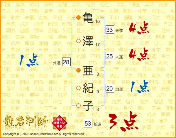 亀(16画)澤(17画) 亜(8画)紀(9画)子(3画)