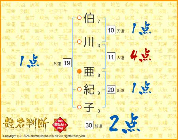 伯(7画)川(3画) 亜(8画)紀(9画)子(3画)