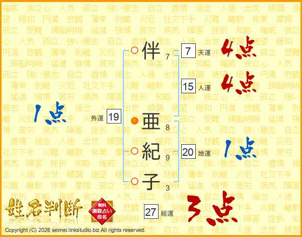 伴(7画) 亜(8画)紀(9画)子(3画)
