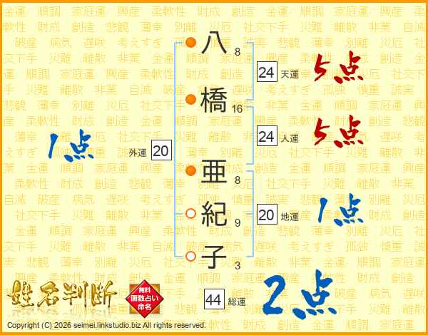 八(8画)橋(16画) 亜(8画)紀(9画)子(3画)