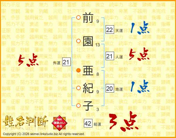 前(9画)園(13画) 亜(8画)紀(9画)子(3画)