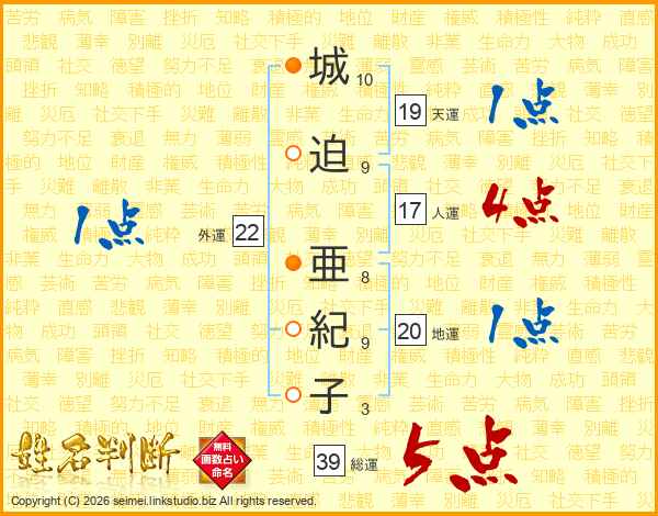 城迫亜紀子さんの総運は39画の5点!